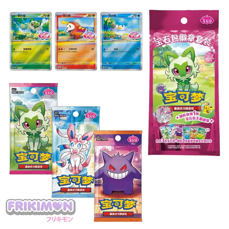 Cada pack contiene una carta de uno de los Pokémon iniciales de Paldea: Sprigatito, Fuecoco, o Quaxly, además de un sobre de Gem Pack Vol 1, Gem Pack Vol 2 y Gem Pack Vol 3. Junto a los sobres y carta especial también encontrarás un pin aleatorio de los 47 modelos disponibles.
